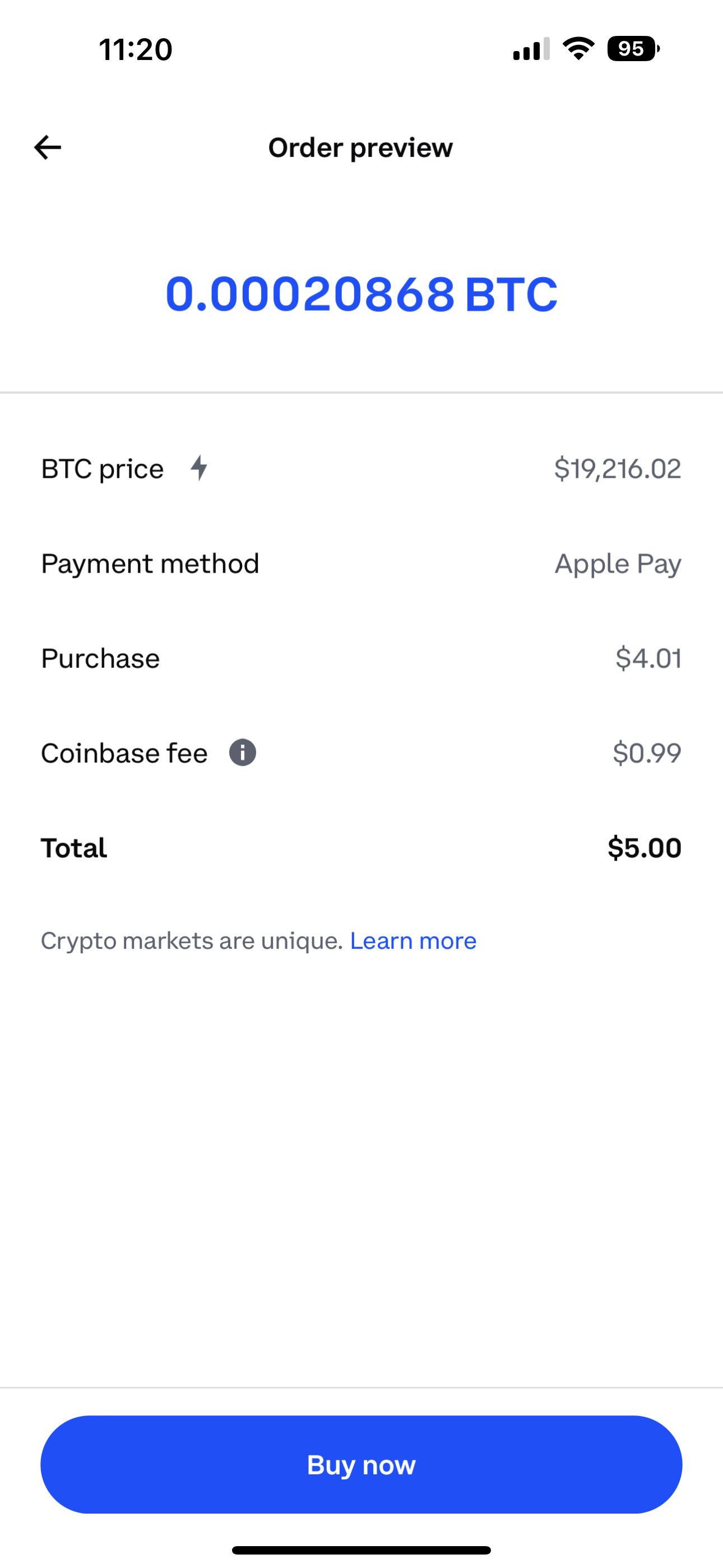 4) Once you have done this, press the “Preview buy” button. Coinbase will now offer an exchange rate and detail the service fee for the card purchase. If you press the “Buy now” button, Apple Pay will pop up on the phone so that you can confirm the purchase.