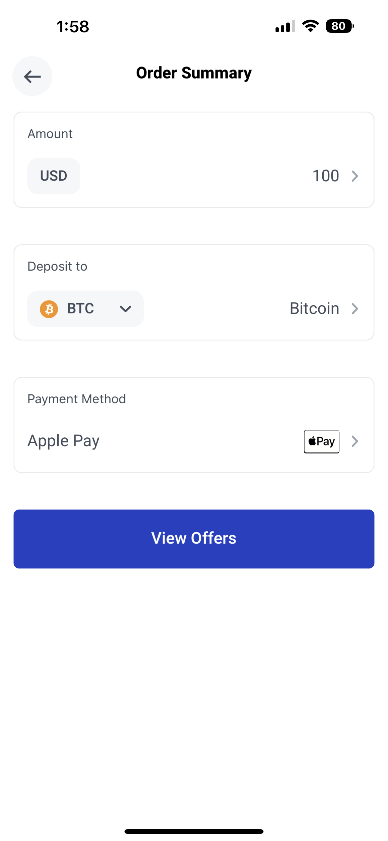 3) Select the cryptocurrency and crypto wallet you want to add. Then select Apple Pay as the payment method and press “View Offers.”