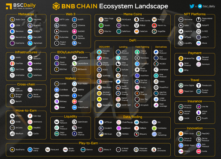 Contrary to many other alt L1s, BNB actually has a powerful ecosystem. This includes decentralized cryptocurrency exchanges, yield farms, NFTs, and more. Here is a list of just a few of the DApps on the BNB chain.