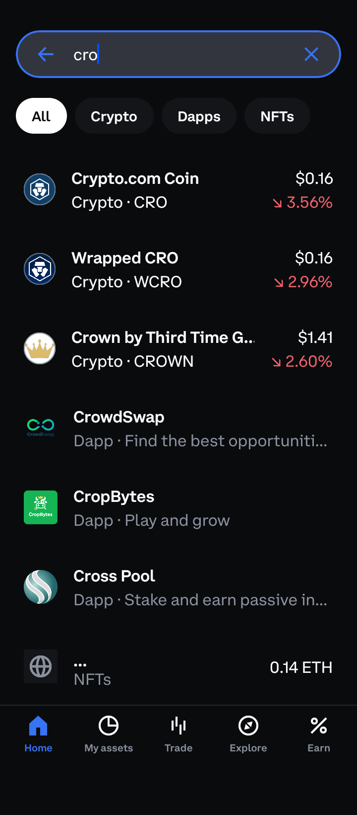 1. Open the app and search for CRO: Open the app and search for CRO. You can also navigate to the “My Assets” tab and press “Sell All” if you are only holding CRO or would like to sell all of your assets.