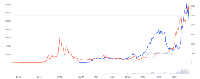 In July 2019, CRO’s market cap was notably lower, highlighting its early stage relative to Ethereum, which already had a substantial market presence. The peak in November 2021 for CRO, with a market cap of about $10 billion and a significant trading volume, marks a critical point of investor interest and market activity.