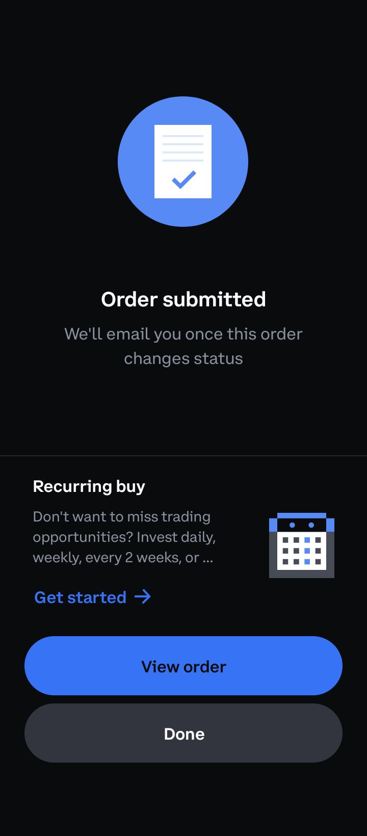 After you have placed your order, you will be redirected to the following page. You can choose to view your order or select “Done” to continue navigating the Coinbase app.