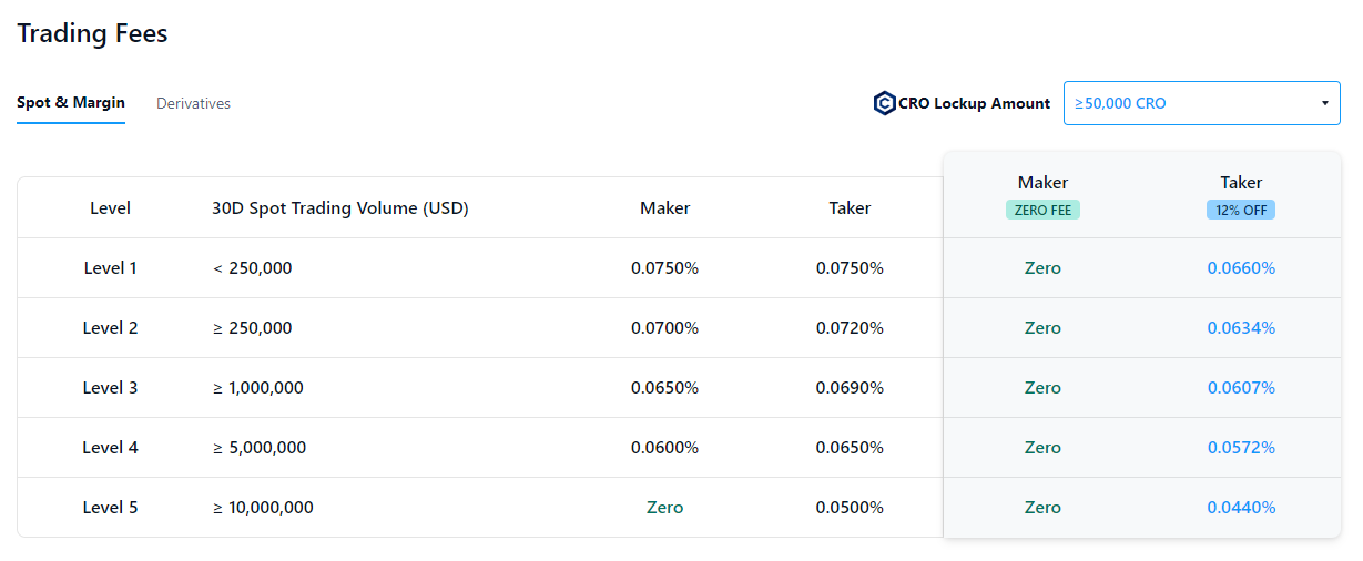 In the case of fees, Crypto.com encourages users to hold CRO for trading discounts by offering up to 30% in rebates for taker fees. The amount of rebates you receive depends on how much CRO you hold. In the example below, users that hold 50,000 CROs or more will receive 12% off on taker fees and zero fees on maker fees.