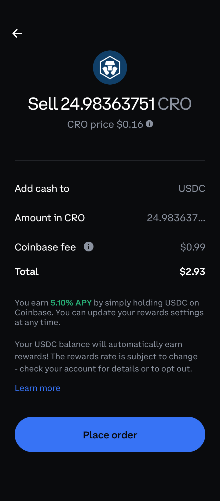 3. Select the amount: Once you have selected CRO from your portfolio, enter the amount you want to sell. As you can see below, you can choose different assets to convert your CRO balance to. Coinbase pays up to 5.10% for holding USDC so we will convert our CRO balance to USD Coin.
