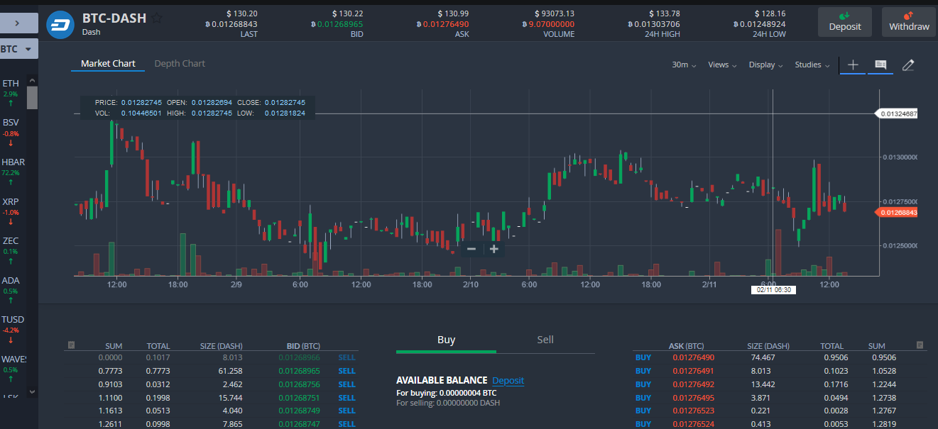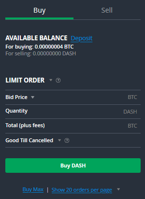 SponsoredScroll down to that window. Make sure the “Buy” tab is highlighted. Here you will see your available BTC and DASH balance, and below the parameters of the transaction.