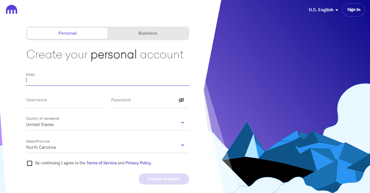 2. Select an account type: After being sent to the following screen, select Personal or Business. Enter the required information and click Create Account.