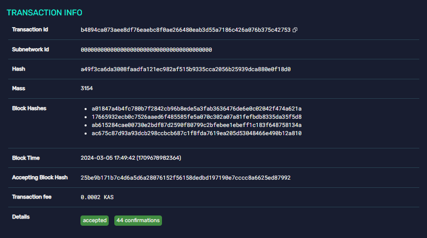 In addition to its revolutionary consensus mechanism, Kaspa is also a popular choice for users who value low fees. Fees on Kaspa are a fraction of a KAS, the native coin. This amounts to fractions of a cent.