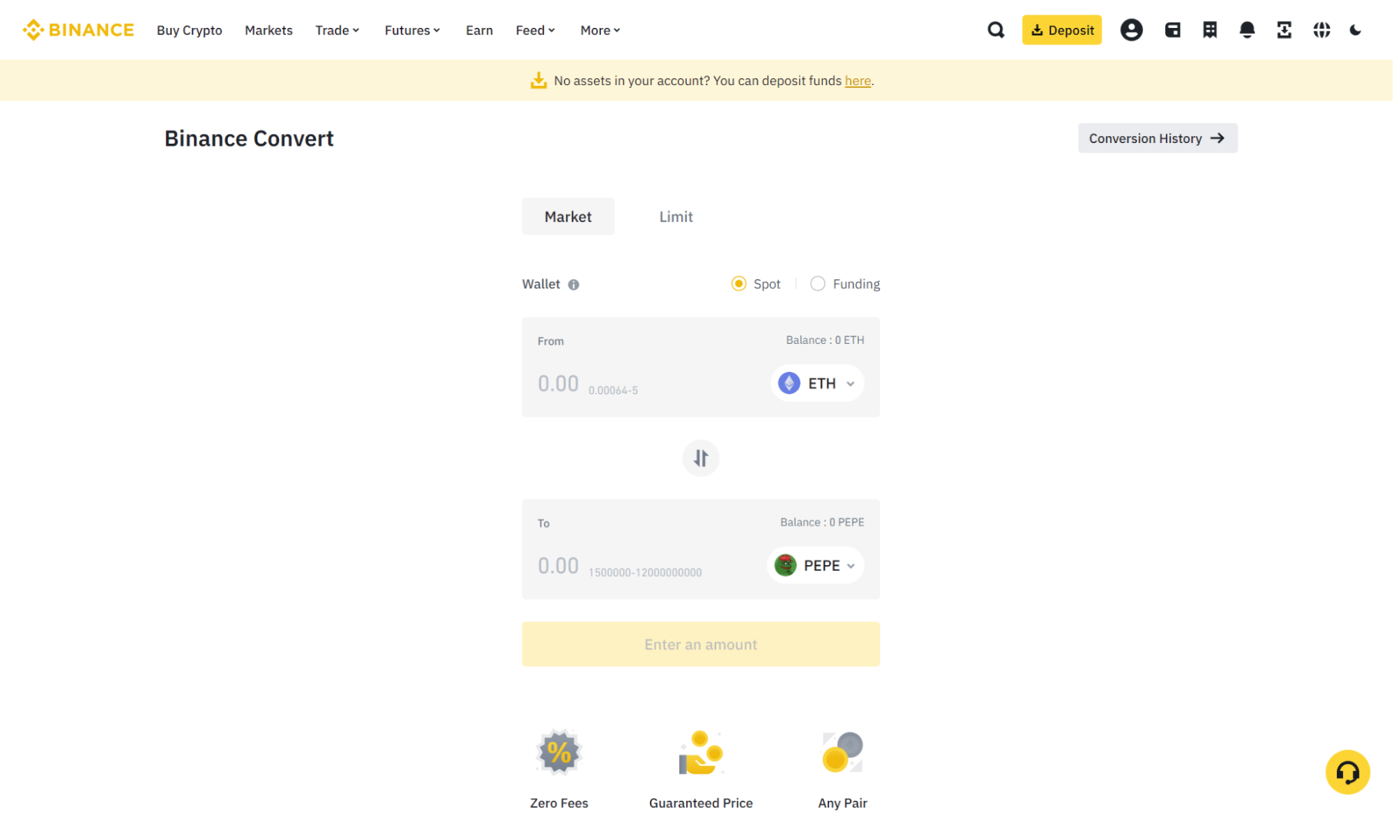 2. Once logged in, click on the “Buy Crypto” option on the dashboard. You will be redirected to the page below. Pepe is available on Binance for direct purchase, and you can use other cryptocurrencies, such as ETH, and swap them for PEPE.