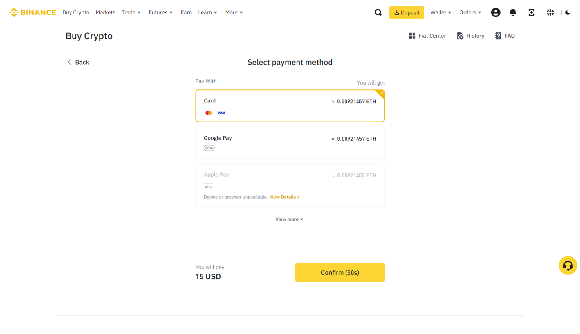 Remember, you have one minute to do this before Binance recalculates your order. Binance also allows you to add up to five different cards.
