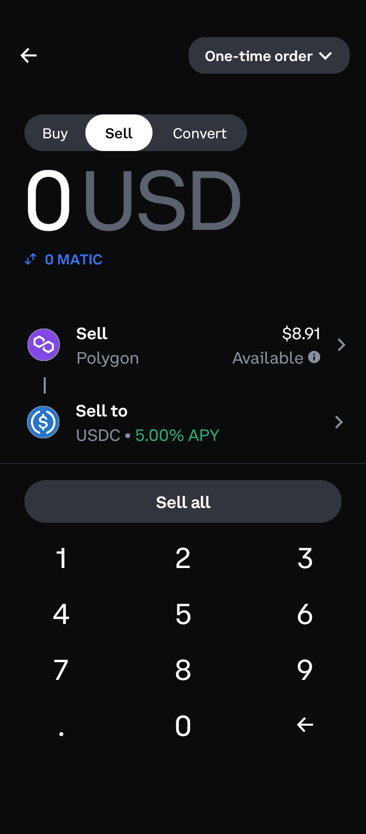 1. Open the Coinbase app and go to “Trade.” In the search bar, select “MATIC,” then press “Sell.”