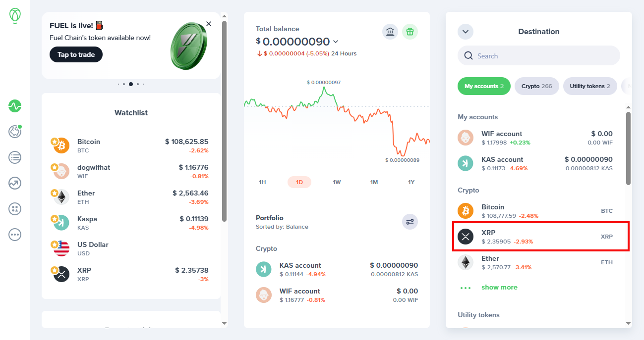 3. Select XRP: Press Select Destination, then select XRP. If XRP does not automatically appear, you can look for it using the search bar at the top of the destination section.