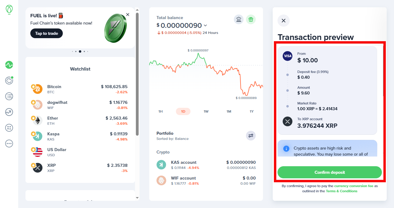 After you are certain that the information is correct, select Confirm deposit to buy XRP with a credit or debit card.