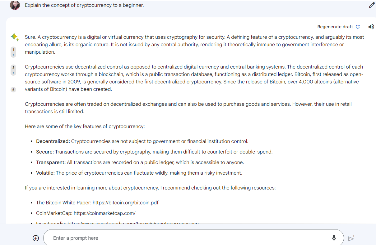 Bard’s explanation is somewhat more succinct, highlighting the secure, transparent, and volatile facets of cryptocurrencies. Additionally, Bard’s response includes resource links for further exploration of cryptocurrency, a feature absent in ChatGPT’s response. In essence, both AI responses are informative and beginner-friendly.