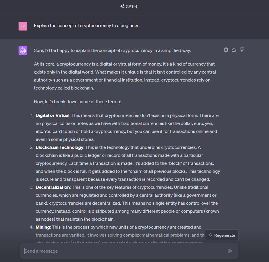 ChatGPT’s response adopts a more segmented approach, breaking down the intricate concept of cryptocurrency into easily understandable chunks. It delves into core concepts such as the digital nature of cryptocurrencies, blockchain technology, decentralization, mining, and the concept of wallets & keys.