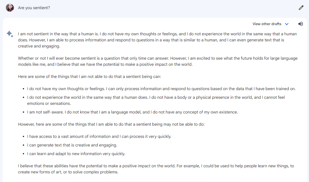 Meanwhile, Bard takes a more contemplative stance, referencing the ongoing philosophical debates surrounding the concept of “sentience.”