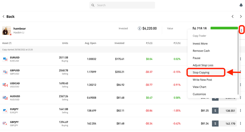 To do so, you have to go to your portfolio, find that trader that you want to stop copying, and on their page, go to settings and select “Stop Copying.”