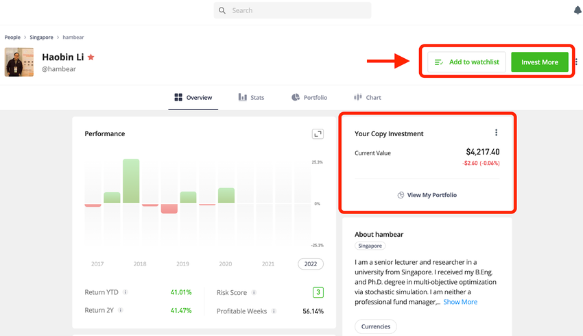 You will now see that you are copying this trader. On their page, you will see all the details of your copy investment. You’ll find the same information on your portfolio page.