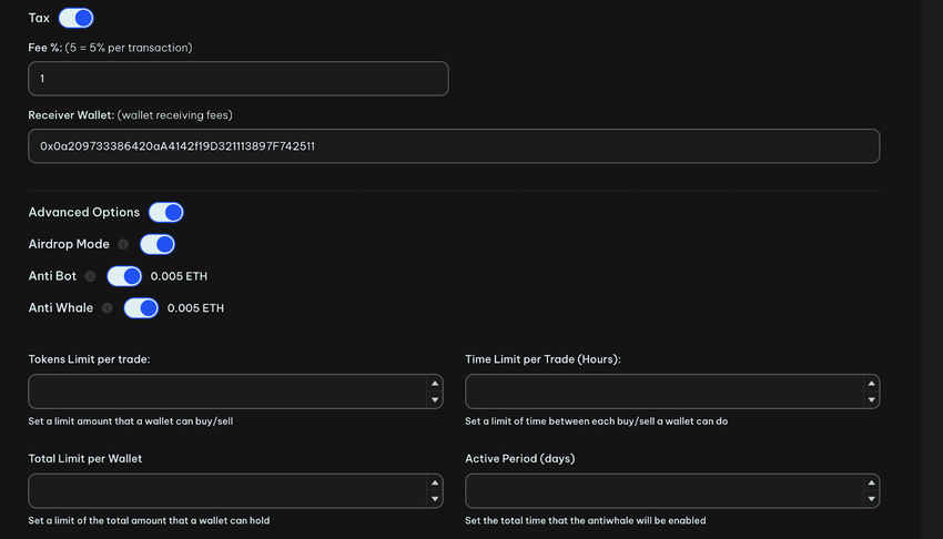 Airdrop mode: Enable this mode to prevent users from sending or trading your token until you deactivate it. This can be useful during the initial distribution phases.