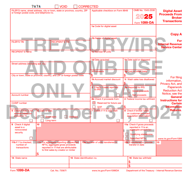 Reporting for the 1099-DA is currently in effect as of Jan. 1, 2025. This means that all trades performed through digital asset brokers will be reported to the IRS in 2026 (not for filing in 2025).