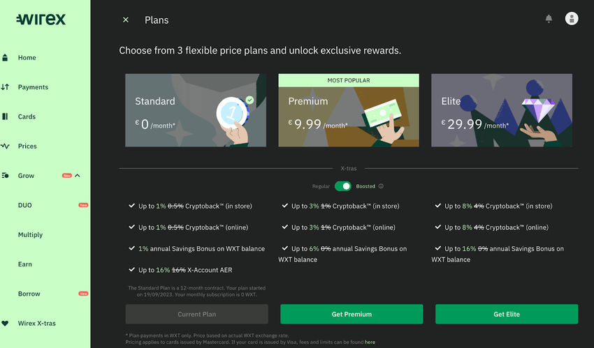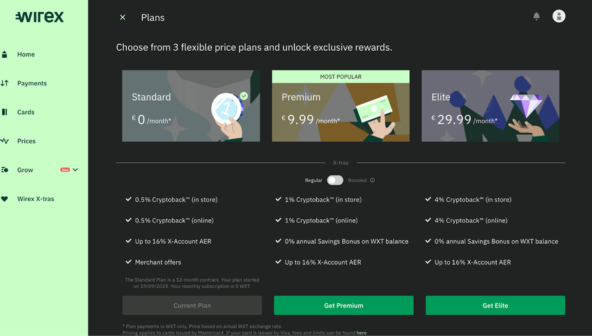 As of 2023, here are the subscription plans offered by Wirex and their Cryptoback rewards percentage.