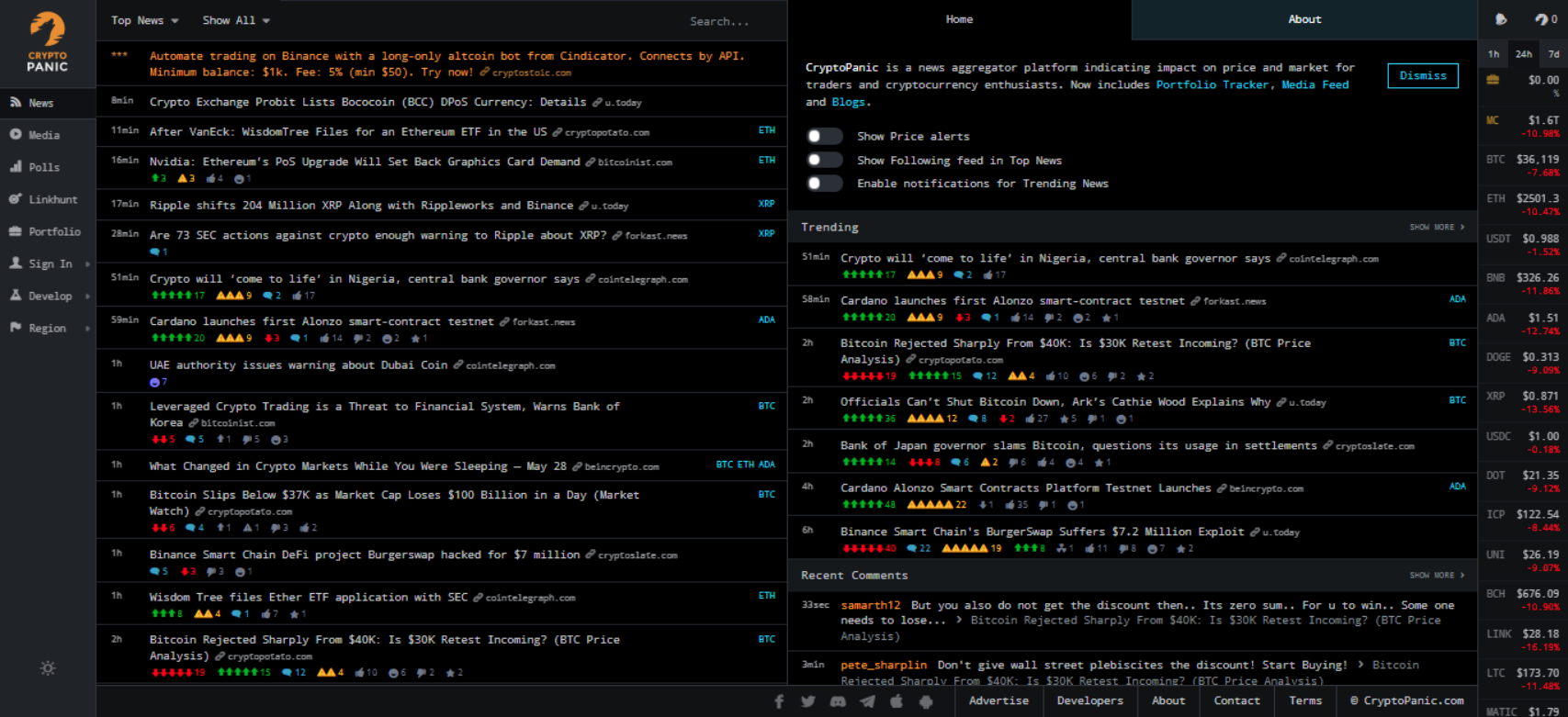 Overall, CryptoPanic is one of the most popular news aggregators, and for good reason. It features no distractions, emphasizing the important information so we can all become informed traders.