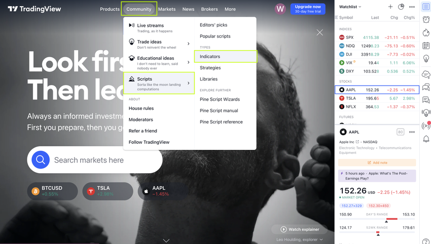 - On the main page of the TradingView website, go to Community > Scripts > Indicators.