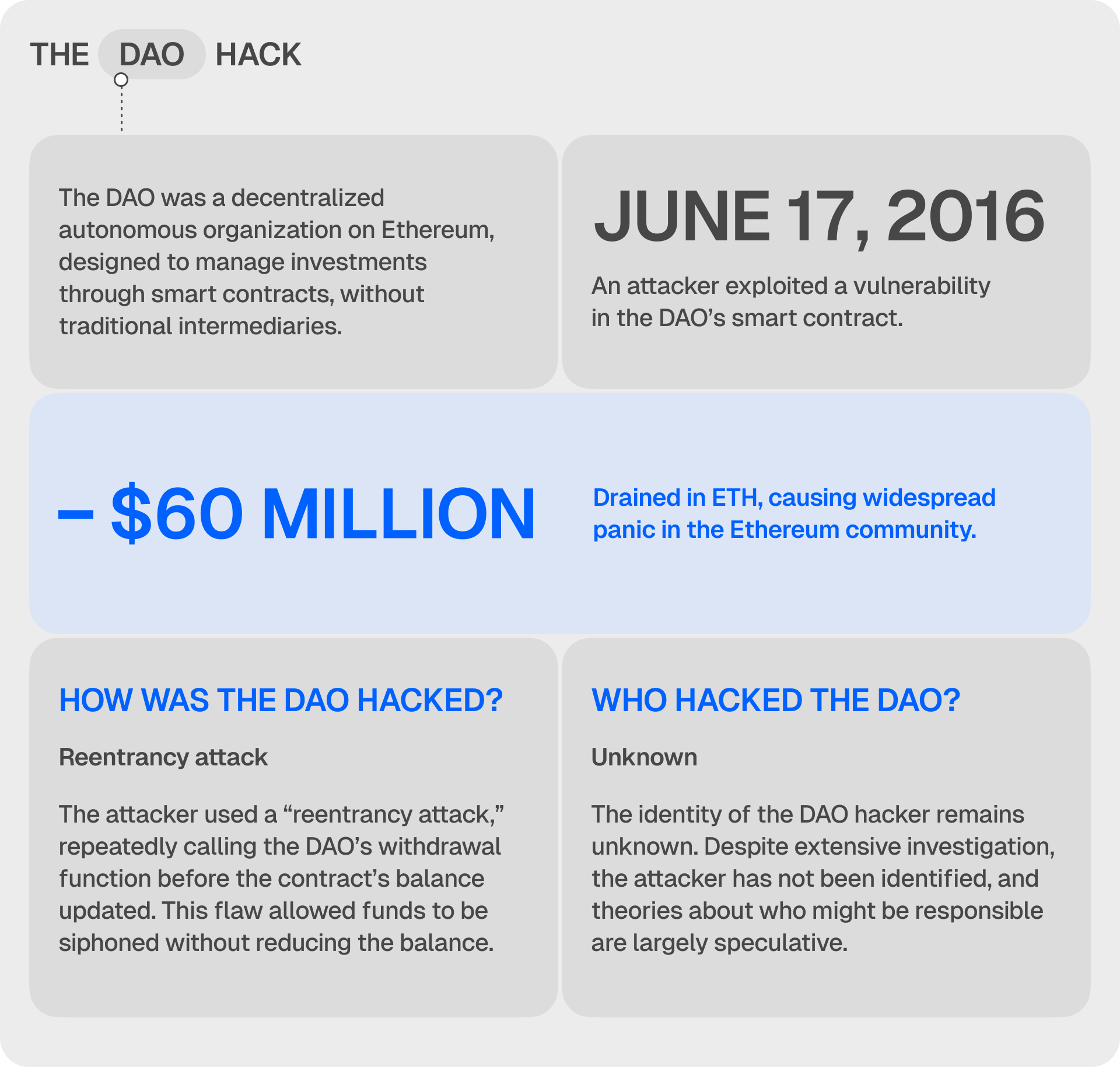 The DAO hack ultimately served as an important lesson for the broader blockchain space. It pushed the entire blockchain industry to prioritize security. In hindsight, the incident shifted crypto funding models from collective DAOs to ICOs, thereby reducing oversight and due diligence.