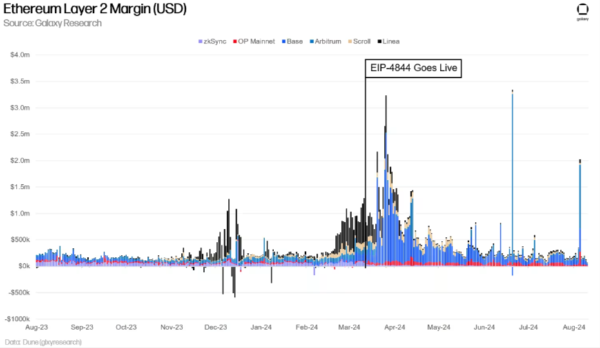 ► While Dencun lowered operating expenses for layer-2 rollups, it also decreased their total revenue, yet increased their profit margins.