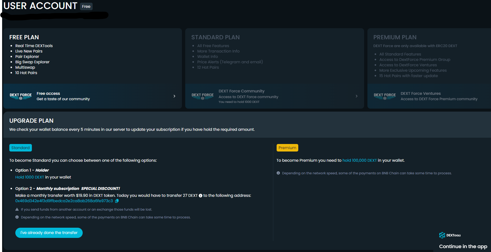Start by linking your web3 wallet, such as MetaMask, to DEXTools. This step is crucial for personalized access to features. Once you connect your wallet, you will be redirected to a welcome screen. Here, you will notice that there are three tiers of user accounts — free, standard, and premium. To upgrade to the standard or premium plan, you must hold 1,000 DEXT and 100,000 DEXT, respectively, in your wallet.