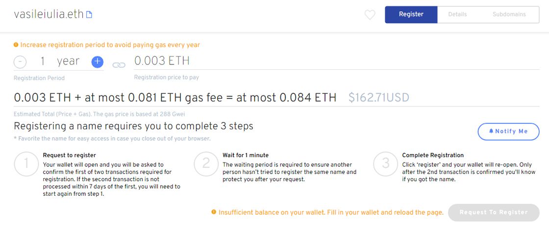 One big difference between ENS and Unstoppable domains is the payment method. ENS domains allow purchases for a limited period of time, just like normal website domains, and you have to renew your domain each time it expires. Since you will have to use Ethereum (ETH) to pay for the ENS domain and have fees, the prices will differ depending on the moment you want to buy the domain.
