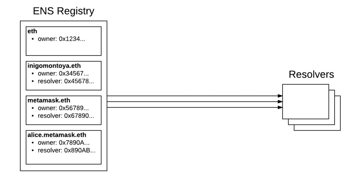 ENS is built upon two Ethereum smart contracts. The first one is the ENS registry, which records all domains registered on ENS. It also stores three crucial pieces of information about each domain. These are the domain owner, resolver, and caching time.