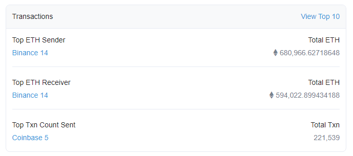 This is a good way to detect crypto whales, as each transaction not only holds the protocol used’s name but also its value. As one would expect, the top crypto whales are crypto exchanges.
