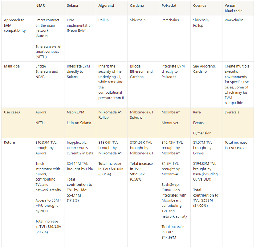- The commercial success of EVM solutions for non-EVM compatible chains can be measured by the amount of TVL and new users they attract (along with the liquidity they bring from Ethereum).