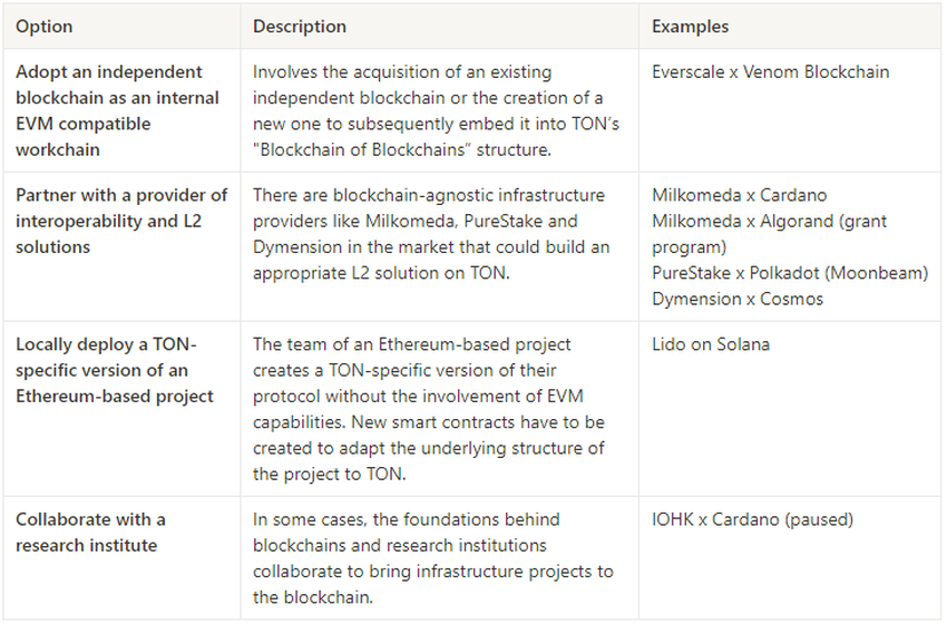 EVM sidechains and workchains appear to be the most appropriate options for TON. This is due to their ability to utilize TON’s unique scaling and transaction processing capabilities while being able to onboard TON users to EVM-based projects. The concept of an EVM-compatible workchain is outlined in TON docs and seems to be the most obvious solution.