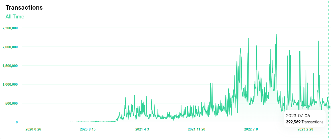 Over 22 million wallets are registered on Flow as of July 2023. Users can choose from a variety of custodial and non-custodial wallet providers. Popular options include Dapper Lab’s own Dapper Wallet (custodial), Math Wallet (non-custodial), and Ledger (non-custodial and hardware).