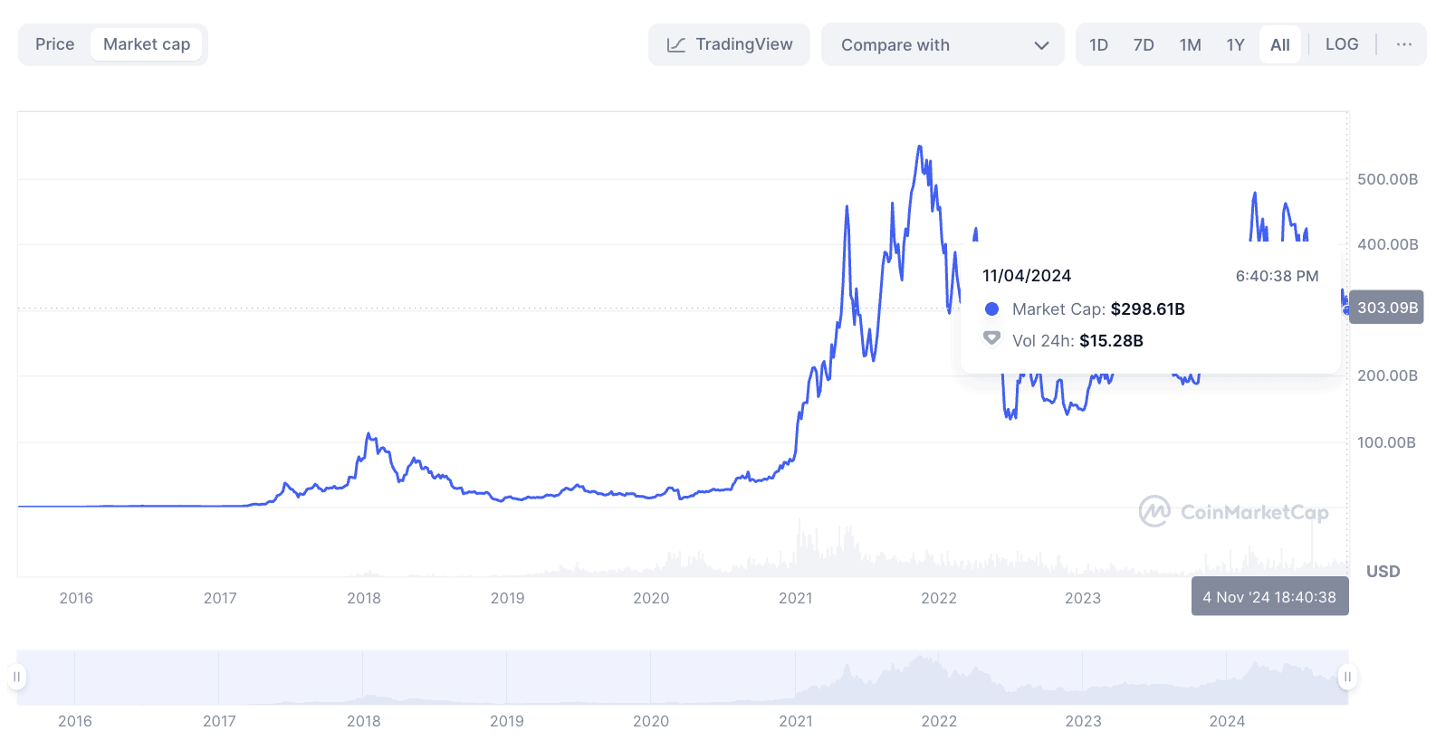 - Market capitalization: The market cap represents the network’s size but doesn’t equate to revenue as in traditional markets. It’s simply the circulating supply multiplied by the token price.