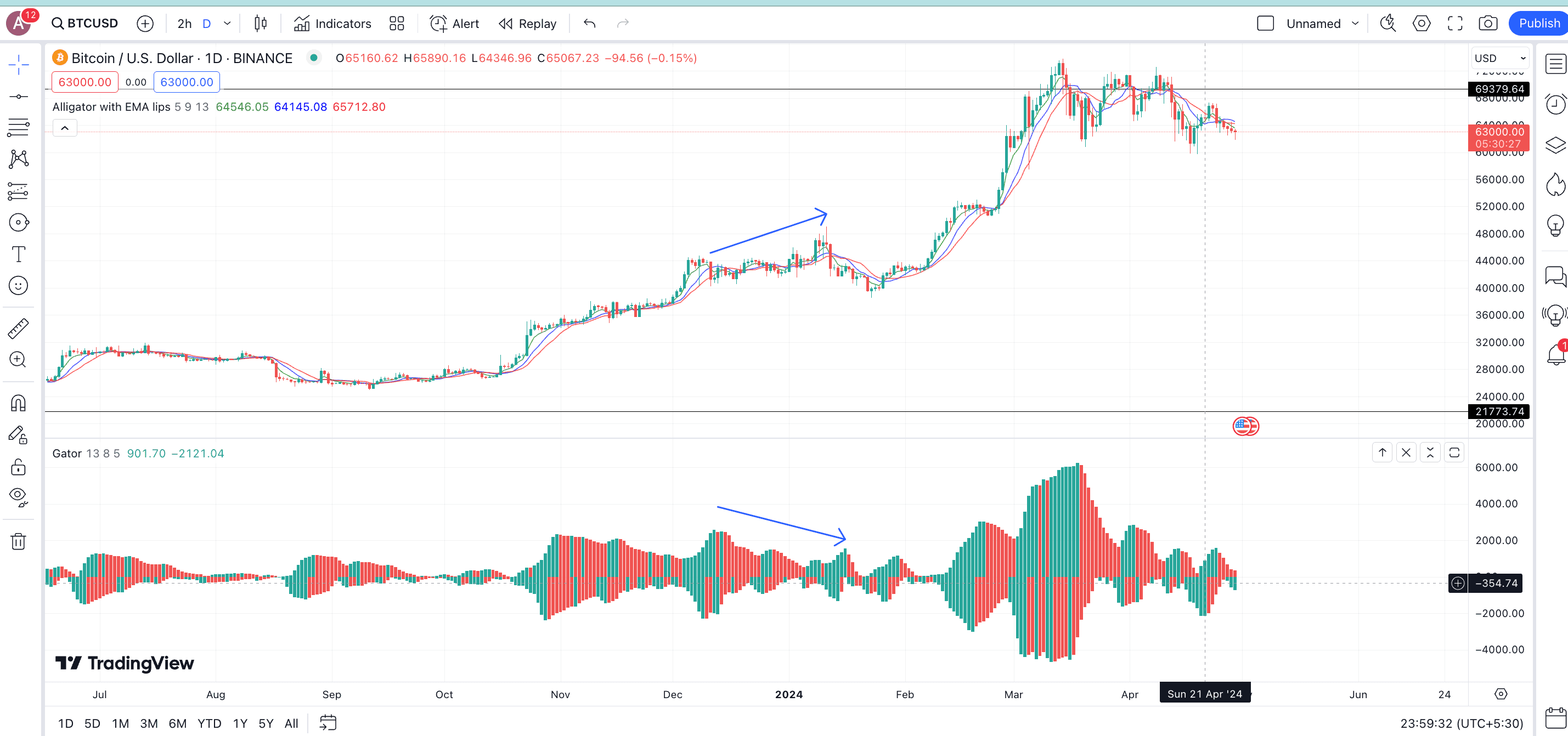 SponsoredThen came the awakening phase with the broadening green bars and occasional red here and there. After this came the price surge, taking BTC to a new high of almost $58,000. Immediately after this high, the Gator indicator started showing green and red bars, hinting a correction and space for traders to exit the trade.