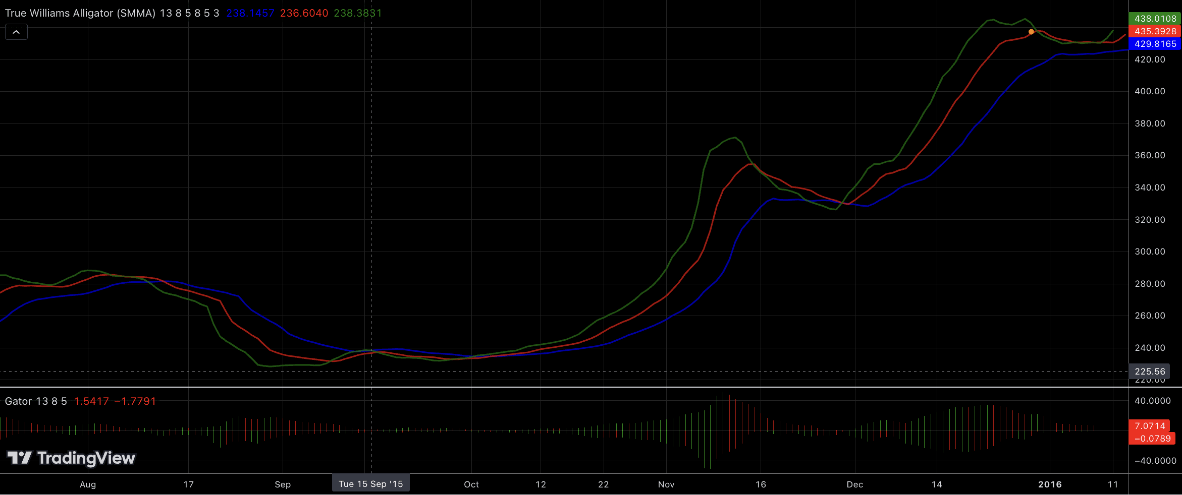 Note: These are the lines and moving average levels set by Bill Williams. The TradingView Gator Oscillator settings, like any other TradingView Indicator, could have slightly different values for the moving average.