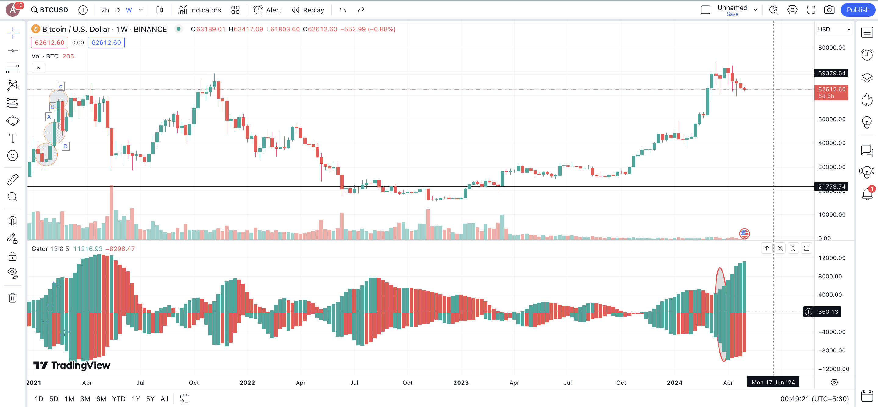 Notice how the weekly BTC chart reveals a more accurate formation of the Gator Oscillator. The ellipse highlighting the oscillator’s specific zone reveals the eating zone, after which the sated zone arrives quickly with sizeable green and red bars.