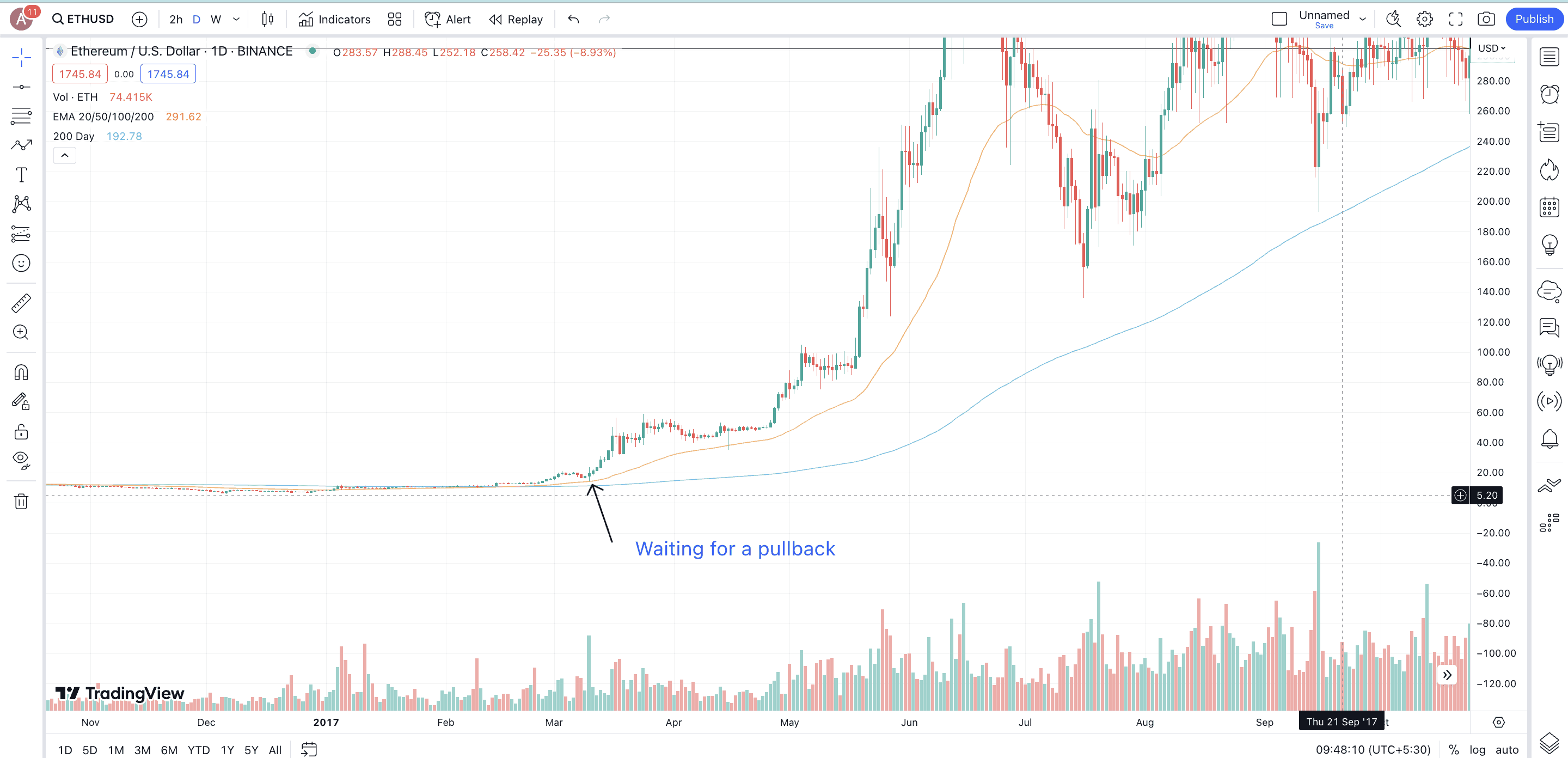 - The moment you start seeing a pullback, you can place the stop loss lower than the desired pullback level — lower than the 50-EMA and the 200-SMA.