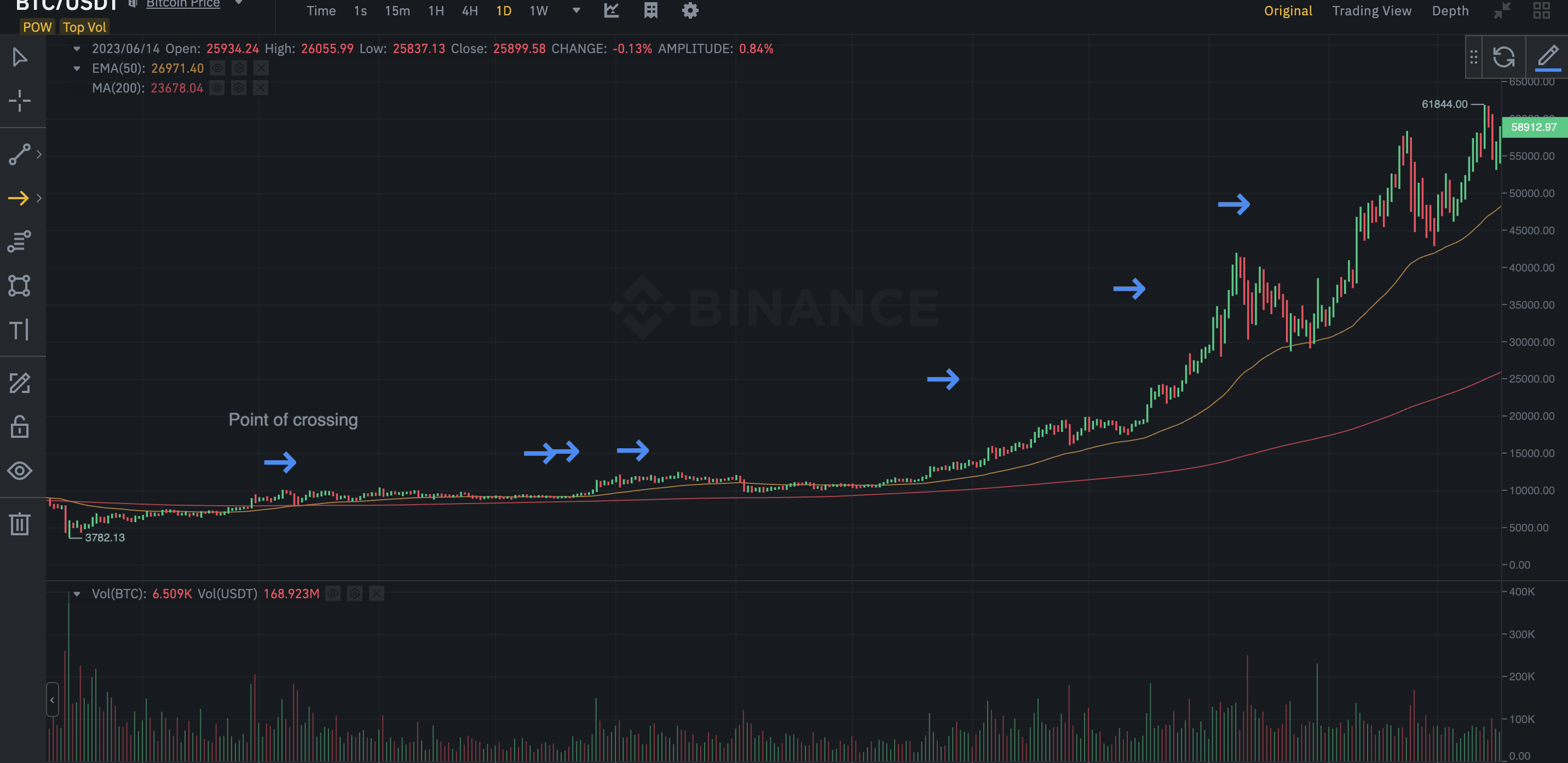 You can refer to this guide on the Wyckoff Pattern to understand more about the volume and price relationship. This can help you trade the golden crossover better.