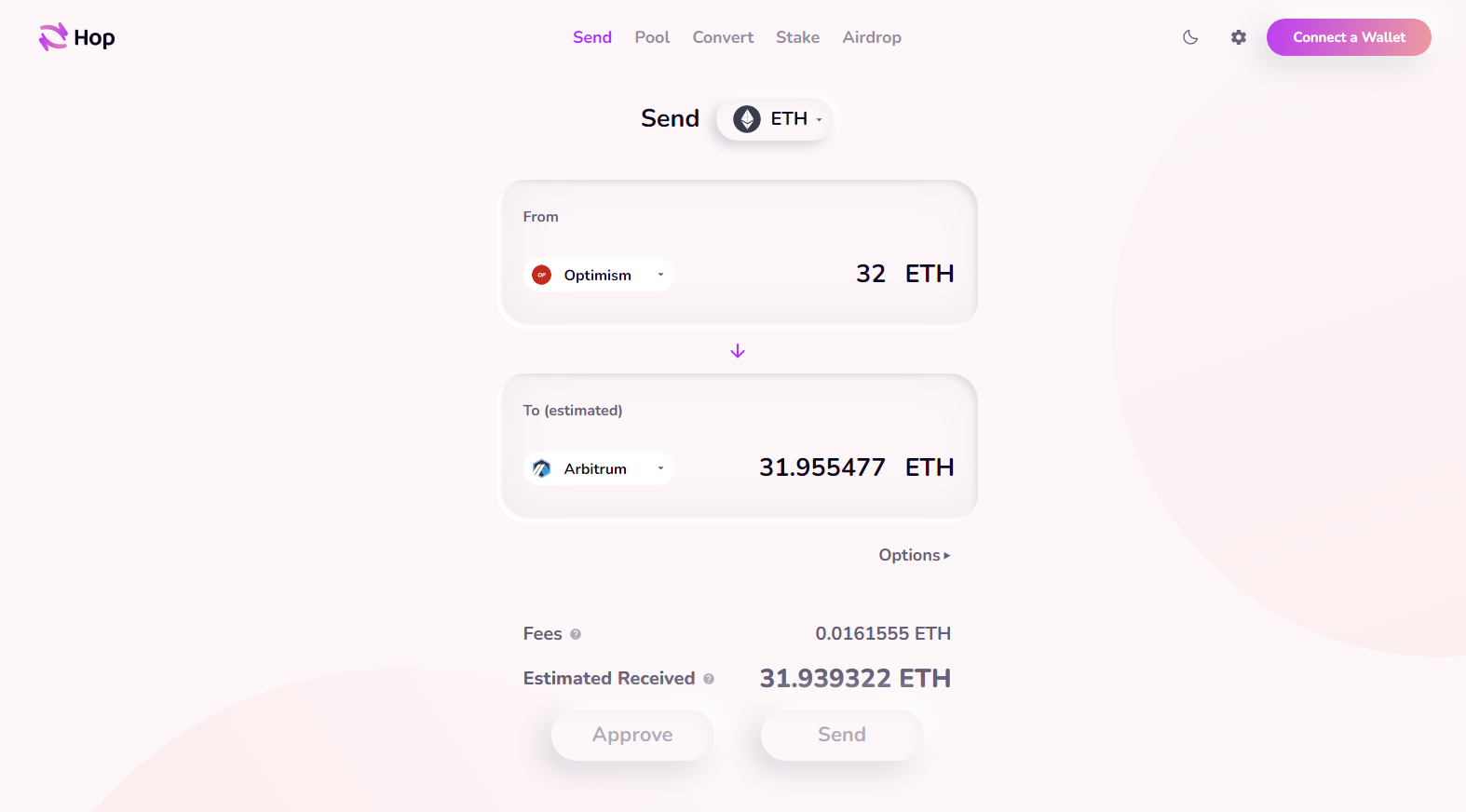 If you invest 4 ETH into the layer 2 Hope Bridge Contract, you can mint 4 Hop ETH from the layer 2 Hop Bridge Contract. Users can redeem Hop Bridge tokens for their underlying assets on layer 2, which then causes the Hop Bridge Token to be redeemed on layer 2 to be burned. Therefore, a Hop Bridge token transferred from one roll-up to another is burned and minted on the destination roll-up.