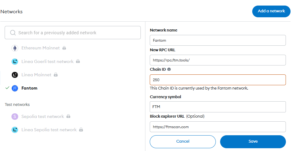 - Add the Fantom Network using the chain ID and an RPC node URL.
