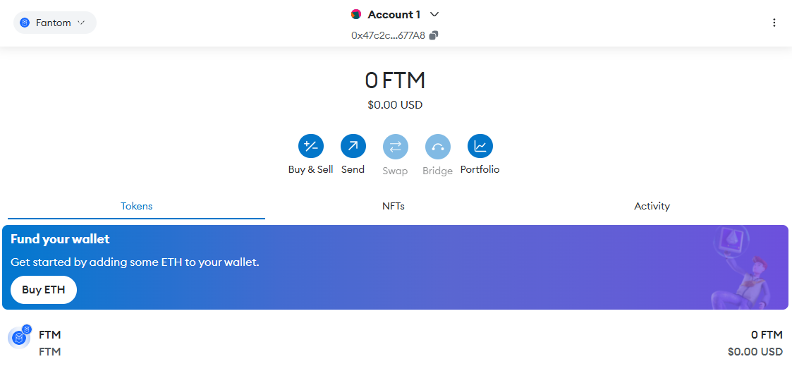 The network should be added successfully now. Click on “Switch to Fantom Opera” to be directed to the network. You will now have access to the network’s features. You may also import or buy FTM tokens at this stage.