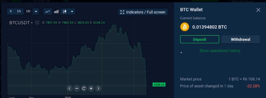 This will bring up information about your wallet as well as the current chart. For this tutorial, we will be using bitcoin and we used an account that already had a small amount of coin in it, but you can ignore that as your wallet will be empty at this point, so go ahead and click on “Deposit” right now.
