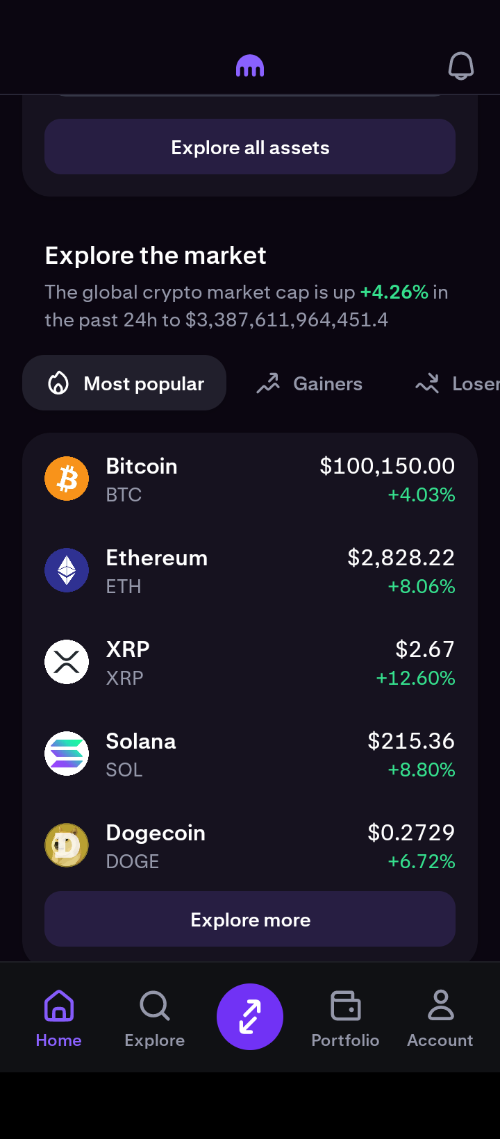 2. Select Solana (SOL): Open the exchange application, scroll down, and select Solana. You can also select the Explore tab or the Exchange tab (purple button, white arrows) to find Solana. However, the first method is the simplest.
