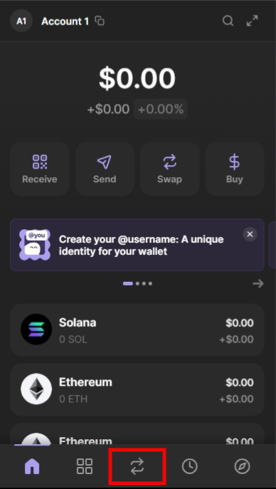 1. Open Phantom: Log in to your Phantom wallet. Scroll down and select the exchange tab. If you have not already, you should send the SOL that you purchased in Step 2 to your Phantom wallet.