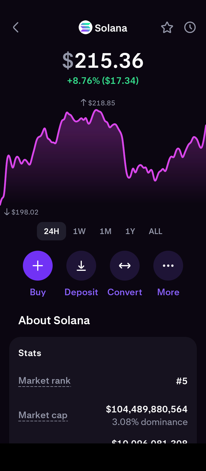 3. Select the Buy button: On the following screen, you will notice the price, the 24-hour change in price, a chart, and a series of buttons. Select the Buy button.