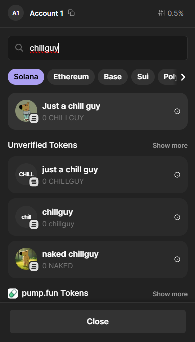 2. Select the You Receive tab: Look for You Receive. This is the token that you will receive and where you will search for Just a Chill Guy (CHILLGUY).