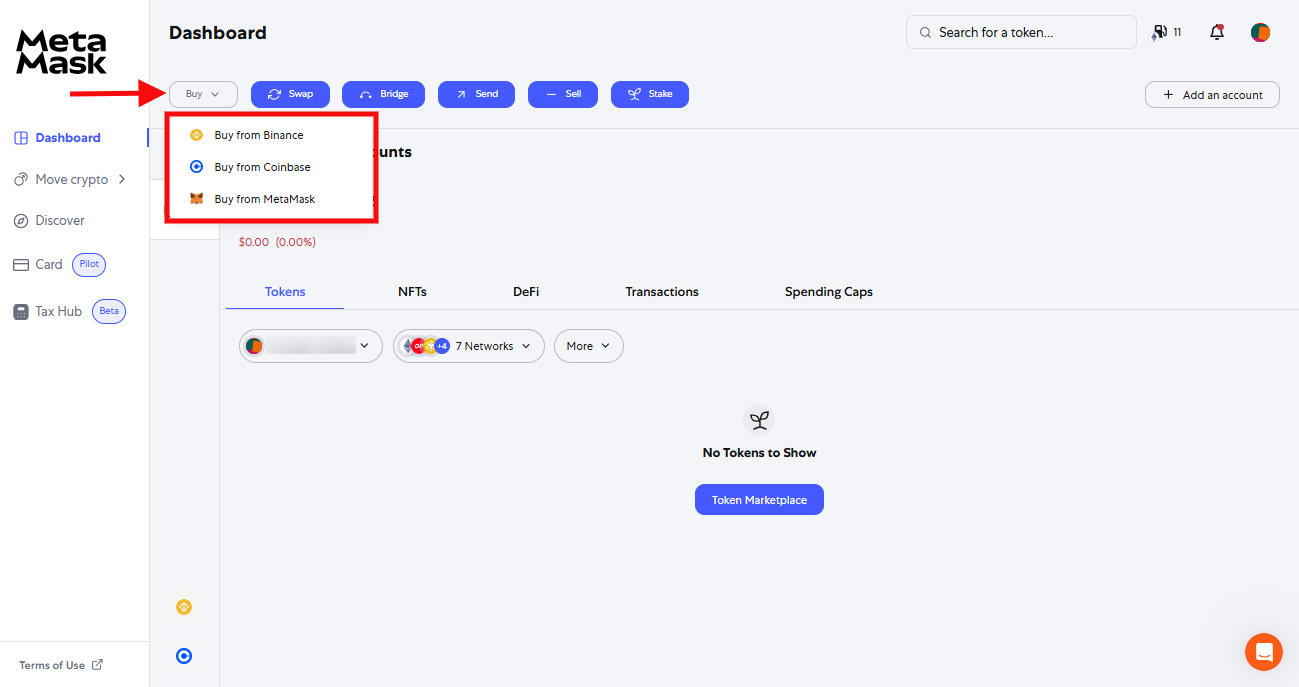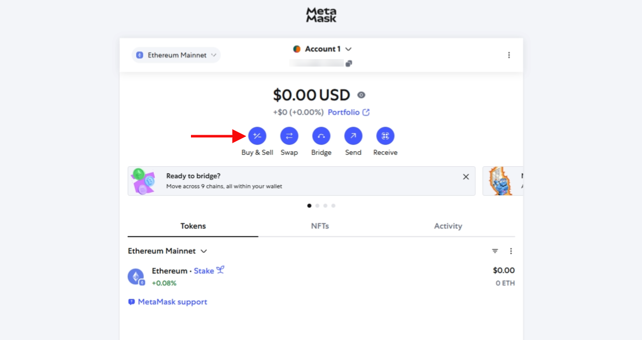 2. Open your MetaMask wallet and click the Buy & Sell button on the home screen.